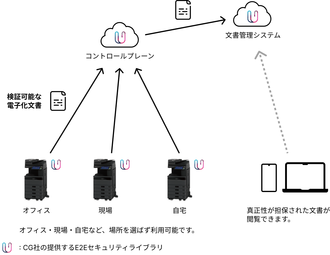 本実証事業では、分散型ID技術であるCGのE2Eセキュリティソリューション(注1)を活用し、デジタル複合機でスキャンする電子化文書の真正性を担保、改ざん検証可能なシステム構築を目指します。東芝テックのデジタル複合機でスキャンするデータを検証可能な電子文書として文書管理システムに保管します。本システムにより、監査証跡(注2)の必要な文書業務のデジタル化を推進し、導入企業のパフォーマンス向上と効率的な業務運用を実現するサービス提供を目指します。
