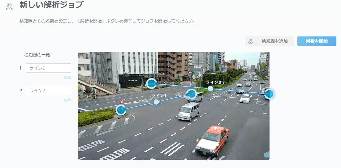計測したい動画をCloud上にアップロードしていただく事で、Cloud上にあるAIを活用し、任意の設定をして通過する車の数と人の数をカウントするサービスです。世界最高レベルの実績あるAIを使用してカウントしているため、90%以上のカウント精度となっており、世界最高レベルの精度でカウントできます。