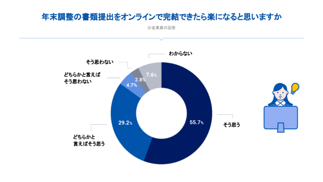 年末調整の書類提出に関して、従業員の55.7%が「そう思う」、29.2%が「どちらかと言えばそう思う」と回答し、オンラインで完結できたら楽になると思う従業員は、84.9%という結果になりました。
