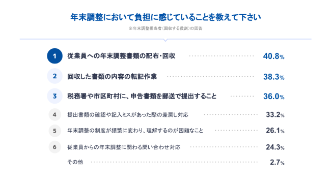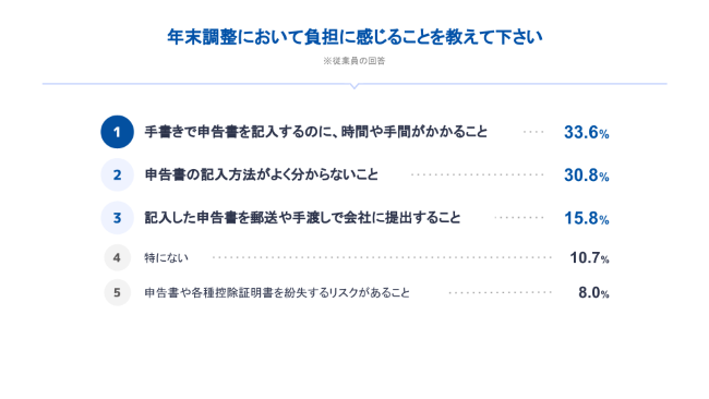 | ■調査結果トピックス 1.年末調整担当者への調査結果 ・年末調整業務に負担を感じている年末調整担当者は全体の60.0% ・負担が大きいと感じている業務の上位3つは「年末調整書類の配布と回収」「書類の転記作業」「申告書類の郵送での提出」 2.従業員への調査結果 ・負担に感じているのは「手書きで申告書を記入すること」「申告書の記入方法がわからないこと」 ・年末調整の書類提出がオンラインで完結したら、楽になると思っている従業員が全体の84.9% |