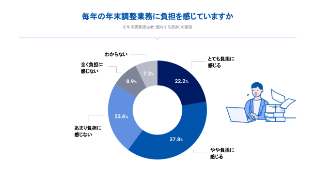 年末調整業務について、担当者のうち22.2%が「とても負担に感じる」、37.8%が「やや負担に感じる」と回答し、年末調整業務に負担を感じている担当者は、60.0%という結果になりました。