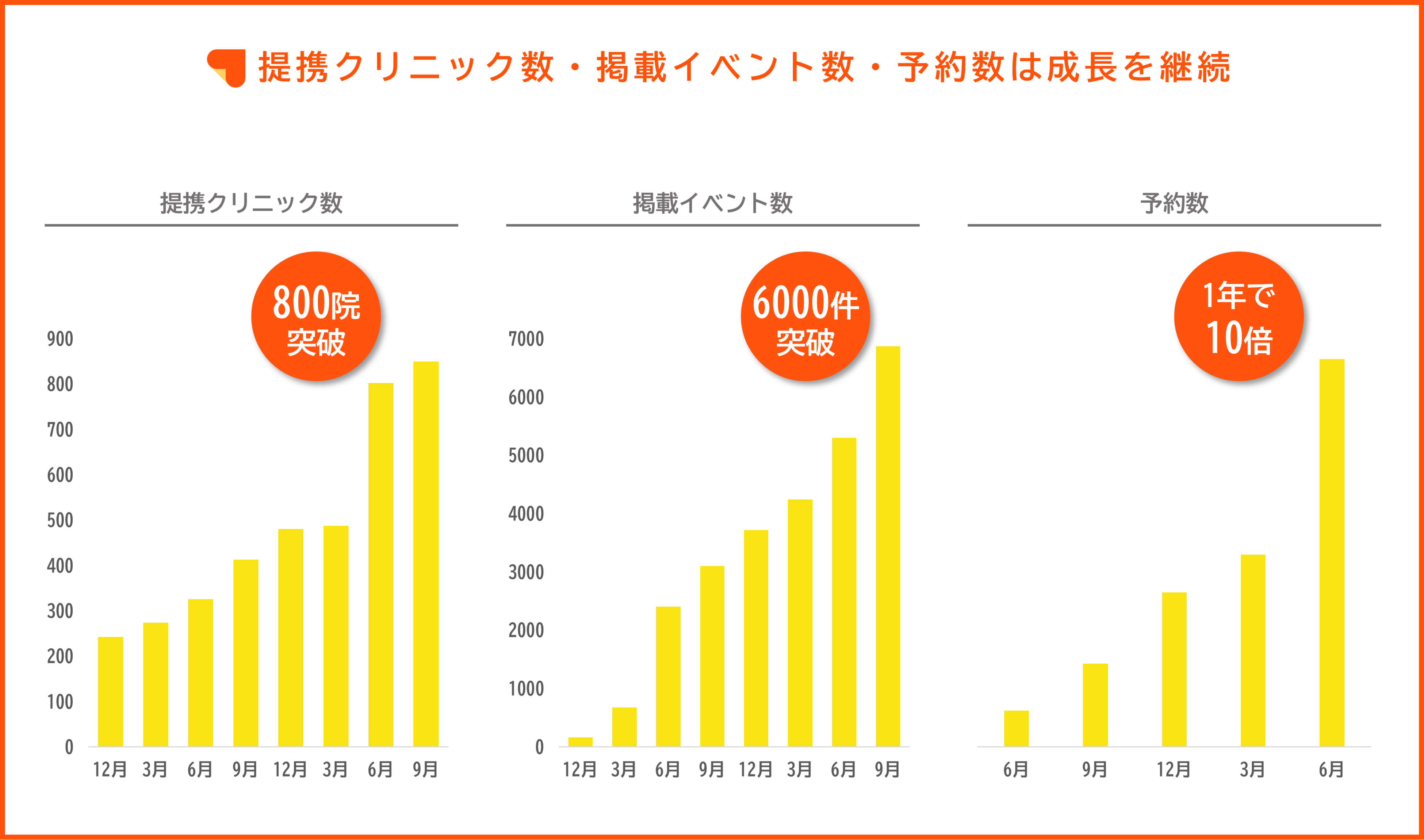 国内提携クリニック数は800院へ到達。美容医療等の施術イベント数は国内最大級の6000件以上へと急成長を維持。オンライン予約数はスタートから約1年半。継続して成長を遂げています。また今春には業界初となる即時予約機能もリリースし、提携クリニック・カスタマー双方から好評をいただいています。今回のプロモーションを経て、カスタマー、クリニックからさらなる信頼を獲得すると共に業界を牽引できるよう成長を遂げてまいります。