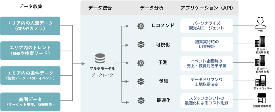 従来のGISソフトでは扱いにくいビッグデータ(位置情報、SNS、衛星画像、カメラ、モビリティ、CO2など)の活用や“なぜその変化が起きたのか”を示唆する因果推論などの高度なデータ解析を簡単に実行できます。また、実績やリアルタイムデータに基づく需要予測や価格シミュレーションも可能で、テーマ毎に適切な行動を推奨する行動変容の設計も強みとしています。
