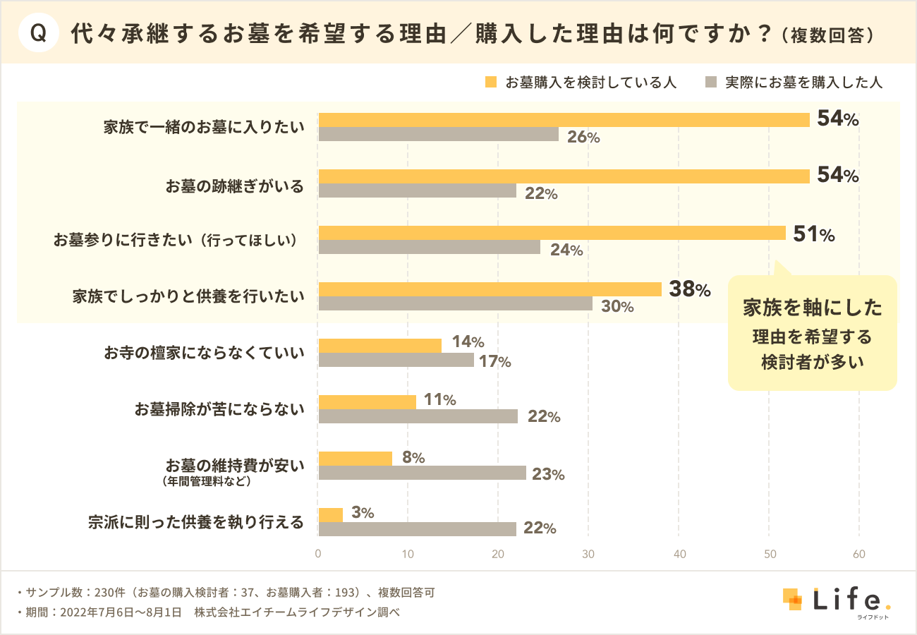 - 子や家族に代々承継するお墓を購入検討している人の想いは「家族一緒のお墓に入りたい」。