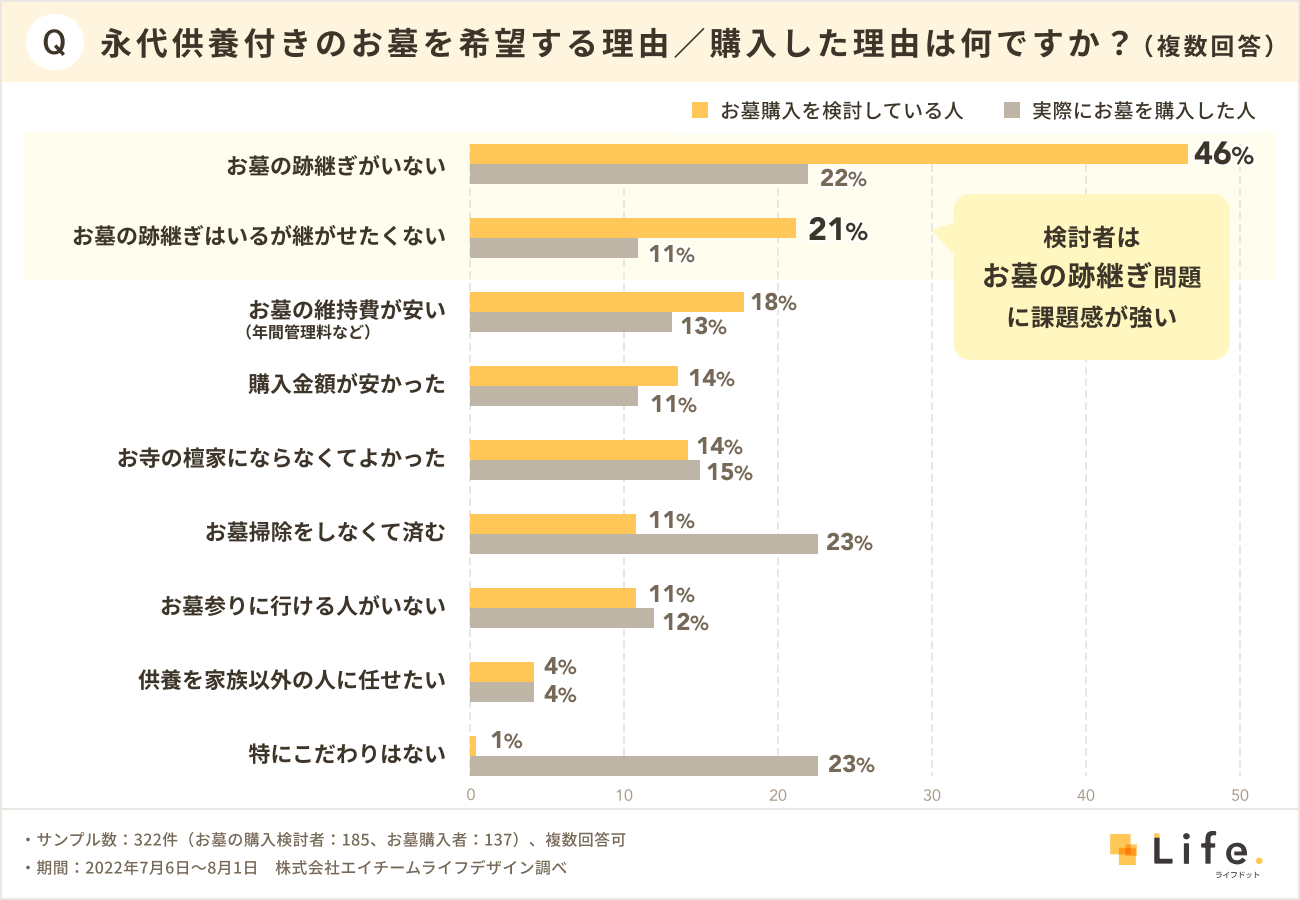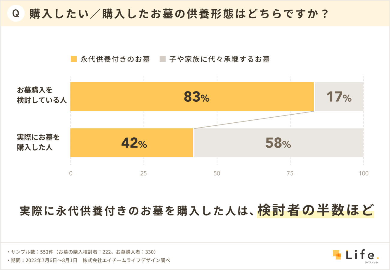 その悩みを解消するべく、ITの力で『一人ひとりの、暮らしの「まよい」を「よかった」に。』をミッションとするエイチームライフデザインが運営するライフエンディングの総合サイト「Life.(ライフドット)」として、お墓の購入検討者がもつイメージと、実際の購入者のリアルのギャップを明らかにすることにしました。