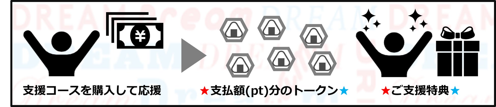 クリエイターは支援を募る目的でトークンを販売し、その収益を支援金として受け取ります。購入者は支援の証として購入額に応じた数量のトークンを受け取ります。トークンを持ち続ける(=保有する)ことで、支援を続けながら、コミュニティを通じて保有数に応じた投票権や抽選特典が受けられます。