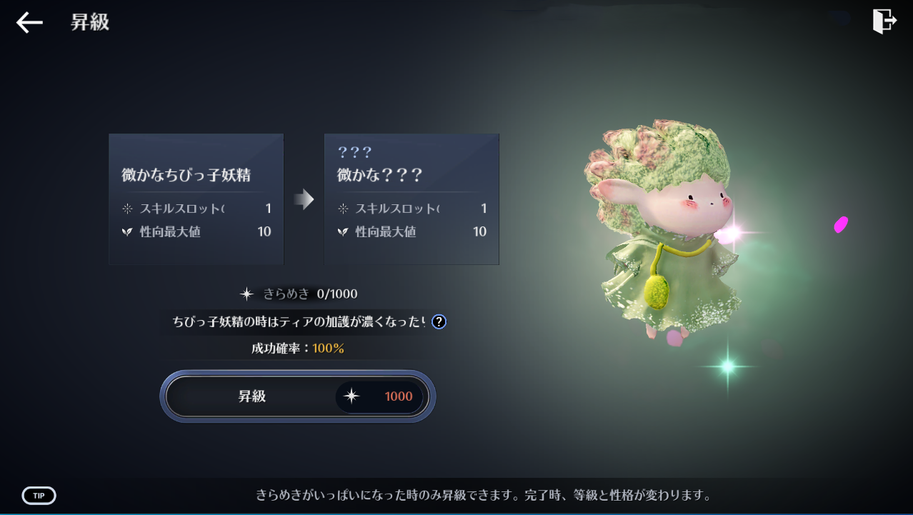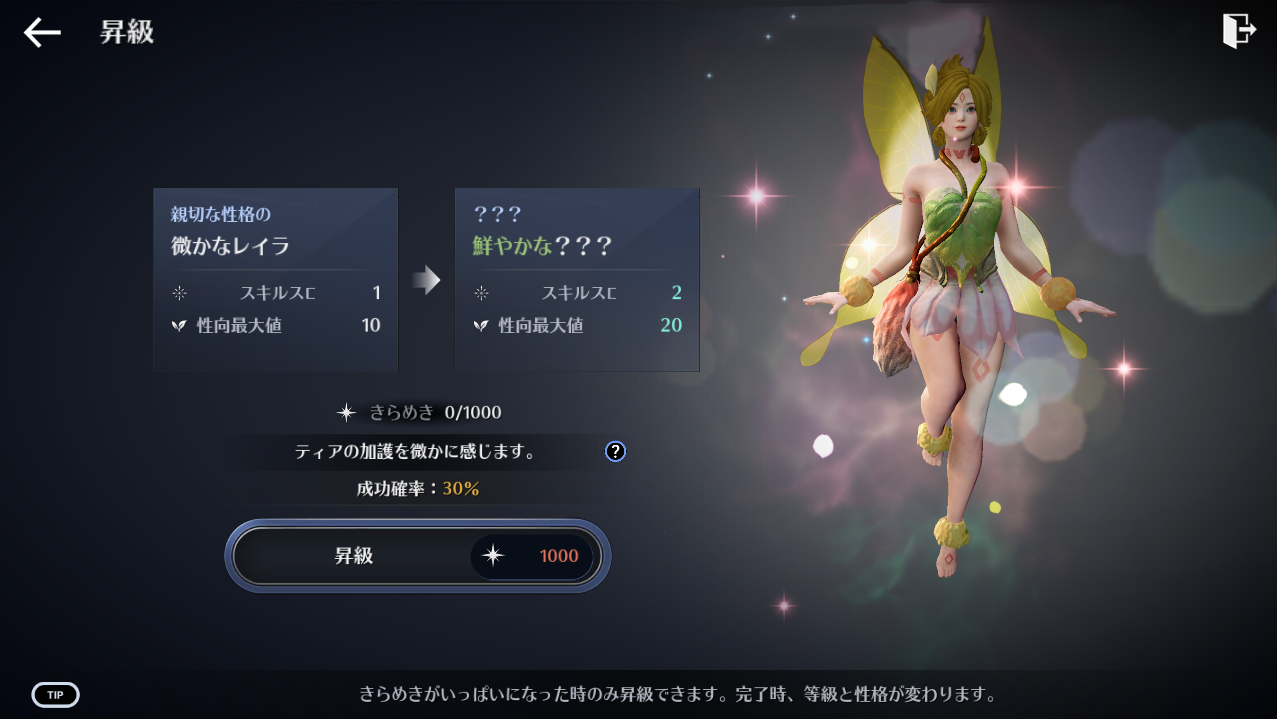 育成の際の会話等の内容によって変動した性向値によって、昇級時に様々な性格や見た目の妖精に成長していきます。