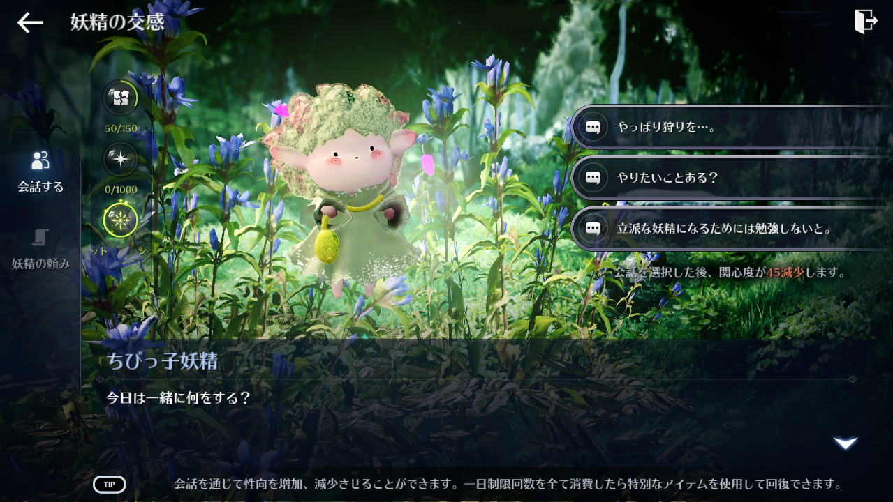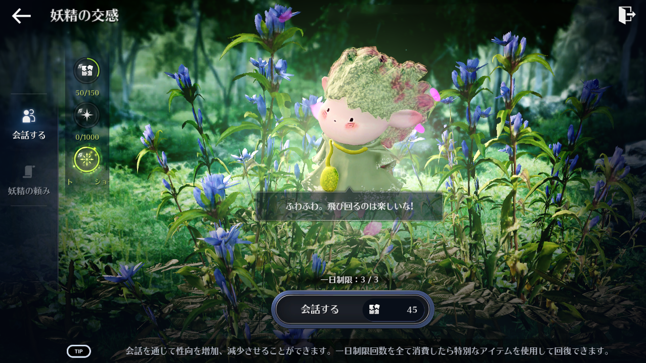 新コンテンツの妖精は育成がメインのコンテンツとなっており、妖精と「瞑想」「ダンス」「歌」で遊んだりする事で妖精の関心度を高めていき、妖精との会話や頼みを進めて妖精の性向値や妖精の昇級に必要な「かがやき」を獲得する事ができます。