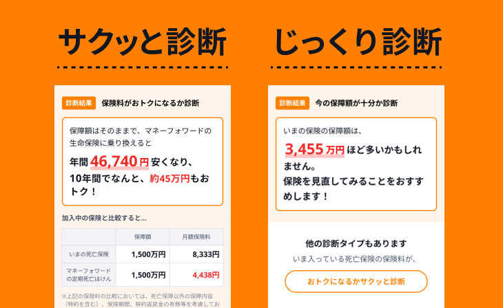 この度本機能のリニューアルにより、現在加入している死亡保険について”保険料の負担が軽くなるか”がわかる「サクッと診断」と、より詳しい情報を入力して”今の保障額が十分か”を確認できる「じっくり診断」の2種類の診断機能を提供します。診断結果をもとにユーザーは、より自分に適した保険料や必要保障額※2、そしてそれらに見合う保険の有無を把握した上で、保険の見直しを検討することが可能になります。