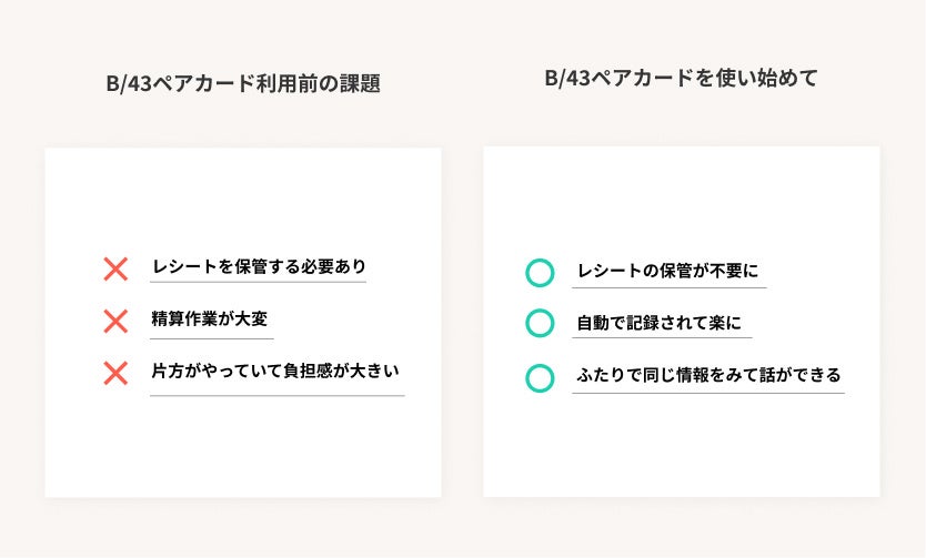多くのペアに使っていただく中で、「自分たち以外のペアがどのように家計管理をしているのか知りたい」というお声を多く頂戴しました。そこで、B/43ペアカードを利用している方の声を記事にまとめ、家計管理についての事例を共有し、おふたりの生活をもっと豊かにするエピソードをユーザーインタビューのかたちでお届けしていきます。