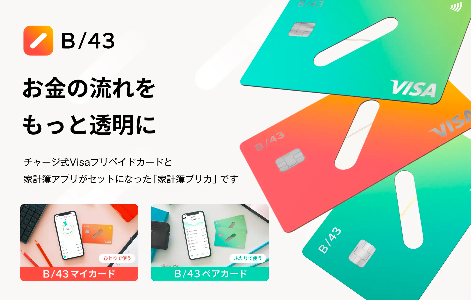 「B/43(ビーヨンサン)」は、Visaプリペイドカードと家計簿アプリがセットになった新しい家計管理サービスです。毎月の決めた予算をプリペイドカードにチャージして支払いを行うだけで、アプリ上に利用明細が記録され、家計簿を自動作成します。