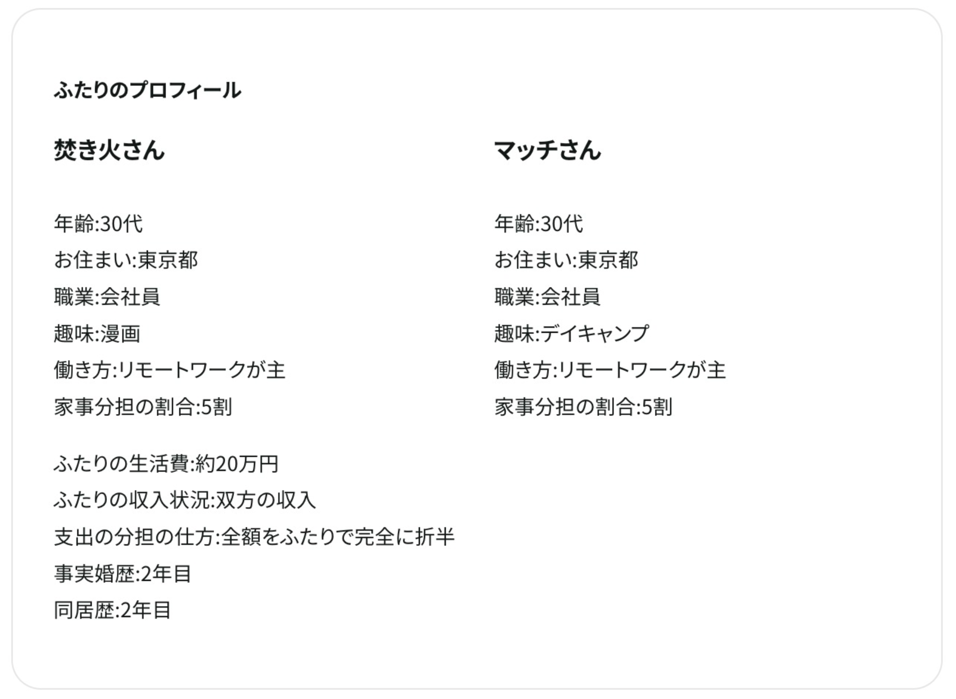 焚き火:基本的に、僕が家賃の支払いを担当し、マッチさんがそれ以外の支払いを担当するような分担をしています。家賃と比べると、それ以外の支払い総額の方が少なくはなるので、その差額分を貯金にしてもらっています。つまり、家賃が100、それ以外の支出が70だった時、30を貯金にまわすイメージですね。貯金については、マッチさん個人の銀行口座で管理してもらっています。