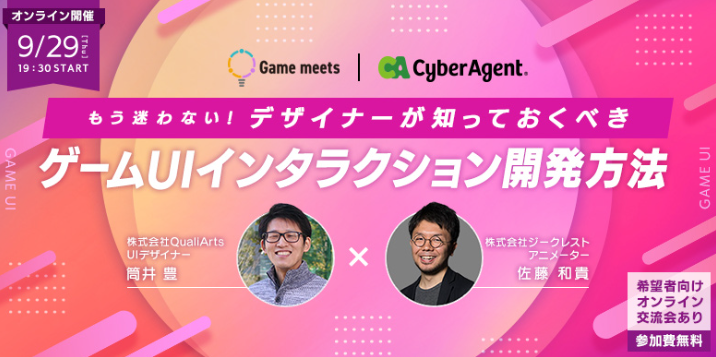 そこで今回のセミナーでは、株式会社QualiArts UIデザイナー・筒井豊氏と株式会社ジークレストアニメーター・佐藤和貴氏をお招きし、ゲーム制作における開発フローごとのインタラクション制作について事例を交えながらお話いただきます。お二人は株式会社サイバーエージェントのゲーム事業部 インタラクションデザイン室にも所属し、インタラクションに関する情報発信も多数行っています。セミナーの後半では、参加者同意のオンライン交流会も予定しています(希望者のみ参加)。