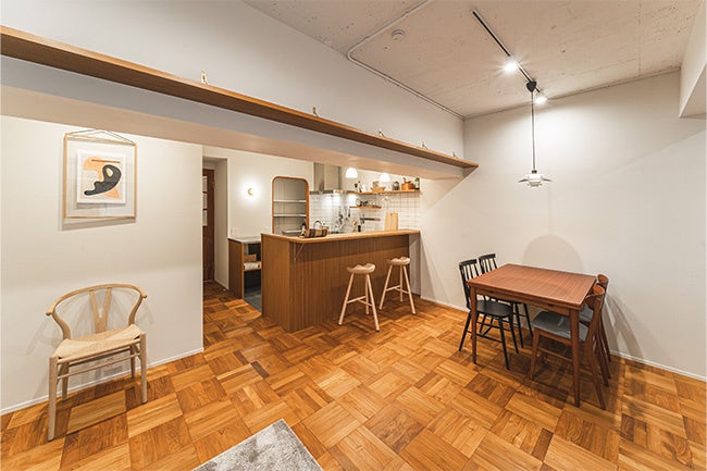 床:北欧ヴィンテージ家具と相性が良い「パーケットフローリング」(木片を寄せ集めて作られた、デザイン性のあるフローリング)をご覧いただけます。