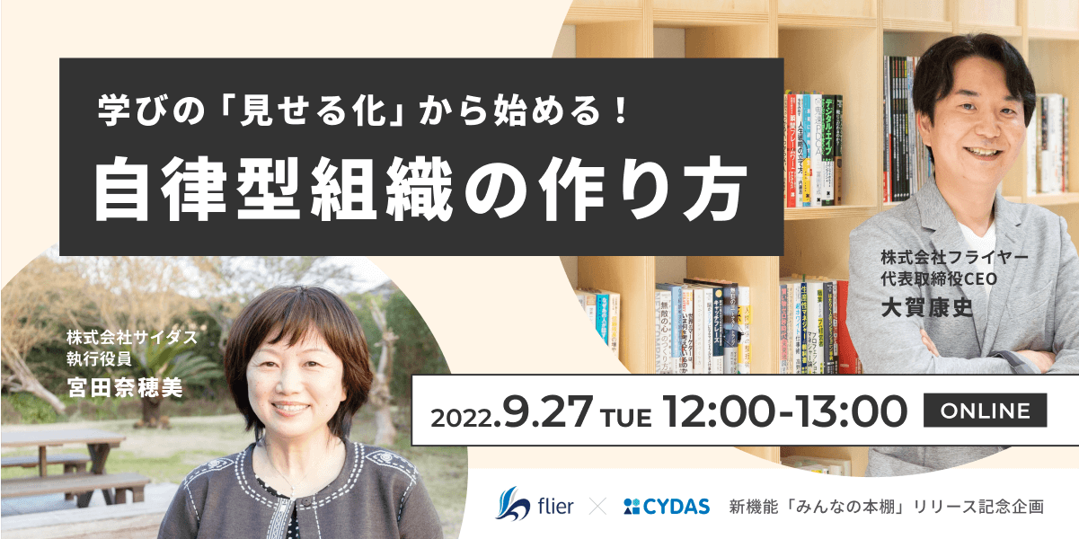本ウェビナーでは、サイダス執行役員の宮田と、本の要約サービスを提供するフライヤー代表大賀氏が登壇。社員の多様な意思やスキルを最大限に引き出しながら、組織としての成果を最大化させるにはどうするべきか。「学びの見せる化」をキーワードに、自律的な組織づくりの鍵となる要素について語り合います。
