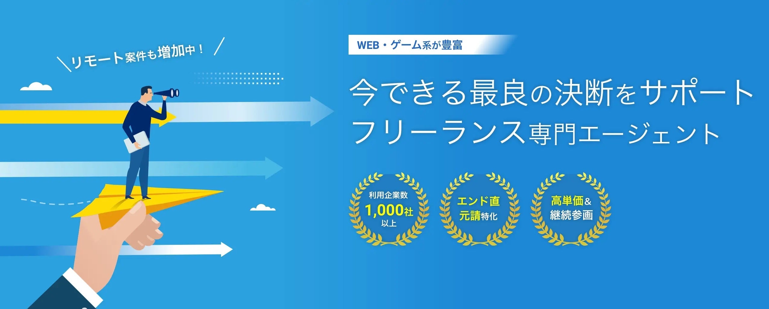 テックタレントフリーランスは、会員登録いただいたフリーランスに、Web・ゲーム系を中心とした案件情報を提供するエージェントサービスです。フリーランスの働き方を応援するパートナーの1社として、ご希望に合わせた案件提案(常駐・リモート案件)から企業との単価交渉、契約業務、案件参画後のフォローまで無料サポートを提供しています。