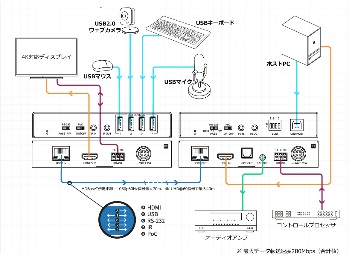 画像劣化の少ない長距離伝送が可能なほか、双方向でのリモコンIR信号、RS-232信号、USB 2.0信号伝送が可能です。送信器と受信器間はUSBの最大データ転送速度280Mbps に対応*1。受信器に搭載した 4 つの USB ポートで計5V/2A(各ポート 5V 500mA)の USB 給電に対応します。プラグアンドプレイ(PnP)で動作するため、ドライバーのインストールやセットアップは不要で簡単にキーボード、マウス、カメラ、マイク、プリンター、ハードディスクドライブなどの機器との長距離接続が可能となります。