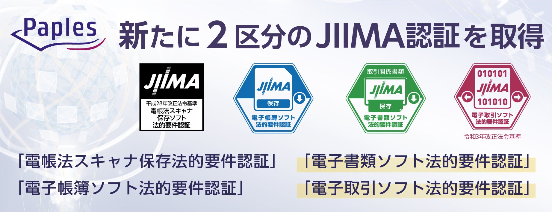 統合電子帳票基盤 Paples(パピレス)は、公益社団法人 日本文書情報マネジメント協会(以下「JIIMA」)が認証する、「電子書類ソフト法的要件認証」、「電子取引ソフト法的要件認証」を新たに取得いたしました。