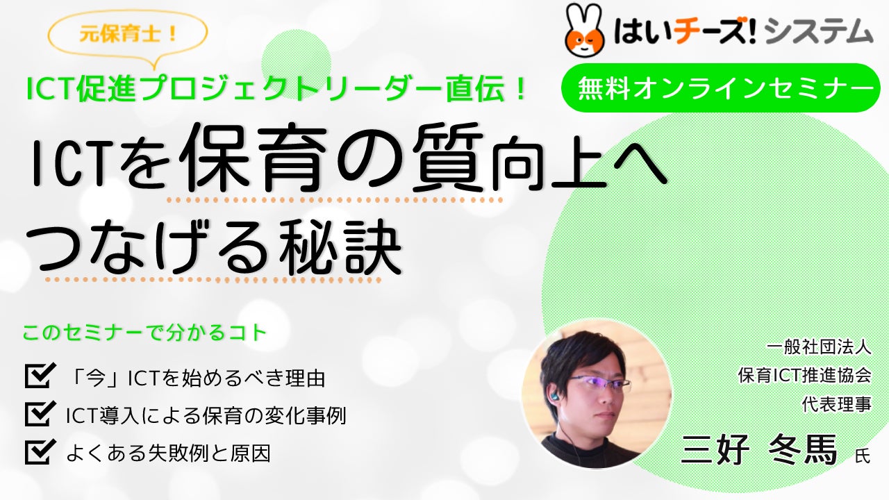 今回のオンラインセミナーでは、保育ICT推進協会 代表理事 三好冬馬氏を講師にお招きして、ICT導入による保育の変化事例を踏まえ、ICTを保育の質向上へつなげる秘訣についてお話しいただきます。