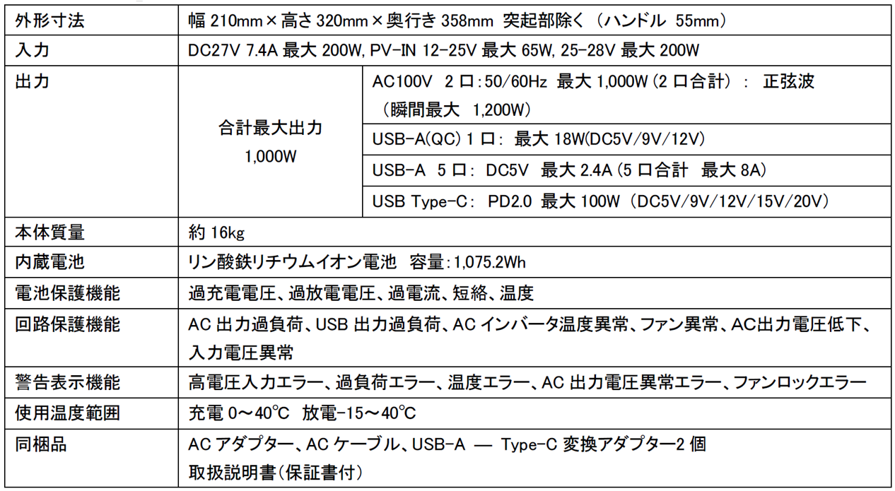 2.電池容量1,000Wh、最大出力1,000W(瞬間最大1,200W)
