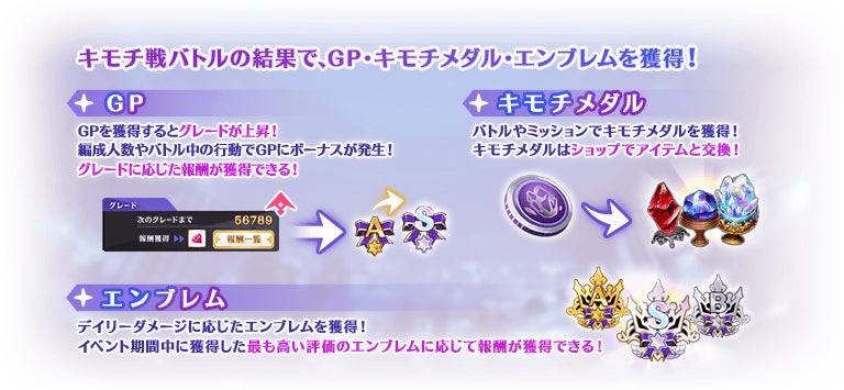 獲得した「エンブレム」が高位になるほど豪華報酬が獲得でき、「GP」が高いほど「キモチメダル」を多く獲得できます。「キモチメダル」はイベント限定ショップで「感情の欠片++」や「レインボーオーブ」等の貴重なアイテムと交換できます。