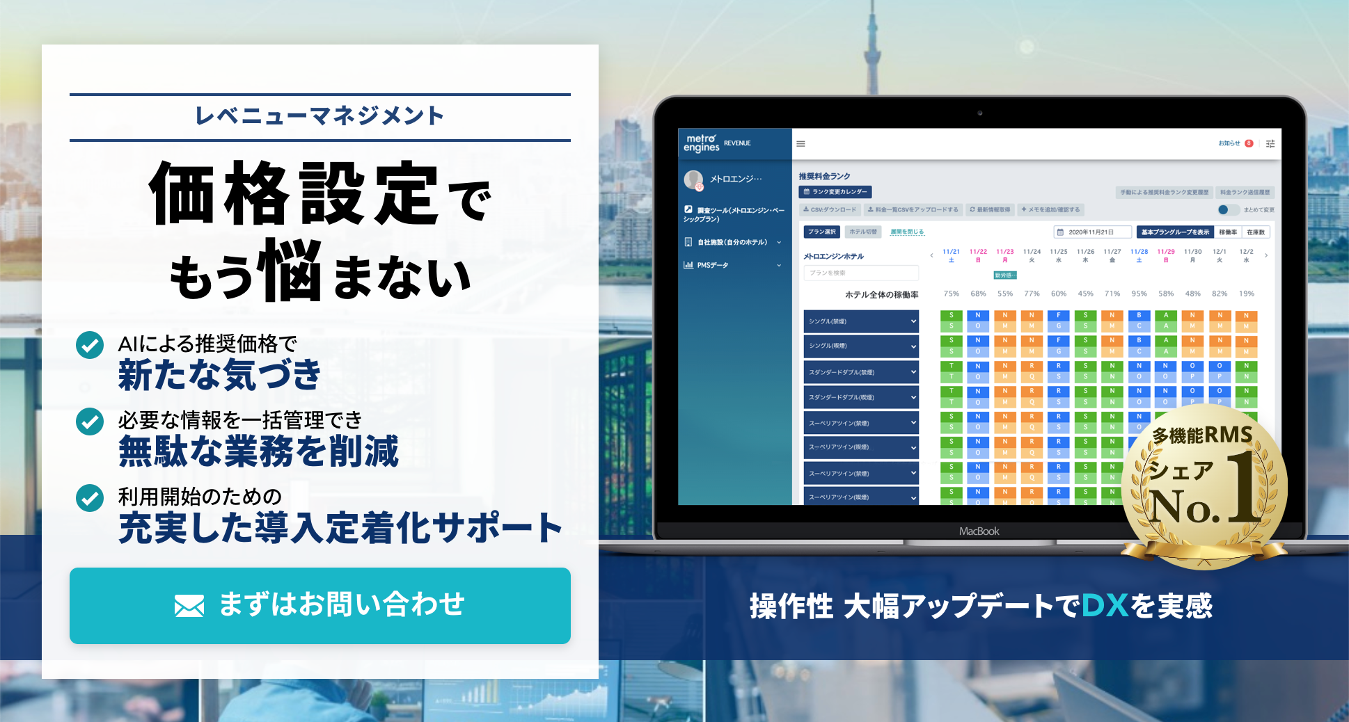 メトロエンジンは、ビックデータから人工知能・機械学習を活用し、客室単価の設定を行うレベニューマネジメントツール『メトロエンジン』をホテルなど宿泊事業者に提供しており、現在では国内でも有数のホテルチェーン社以上と契約しご利用いただいております。昨今では、様々な分野において需給に合わせたダイナミックプライシングの有用性が評価されはじめておりますが、メトロエンジンはホテル業界の他にもレンタカー業界や、高速バス業界などを対象とした事業も展開しております。
