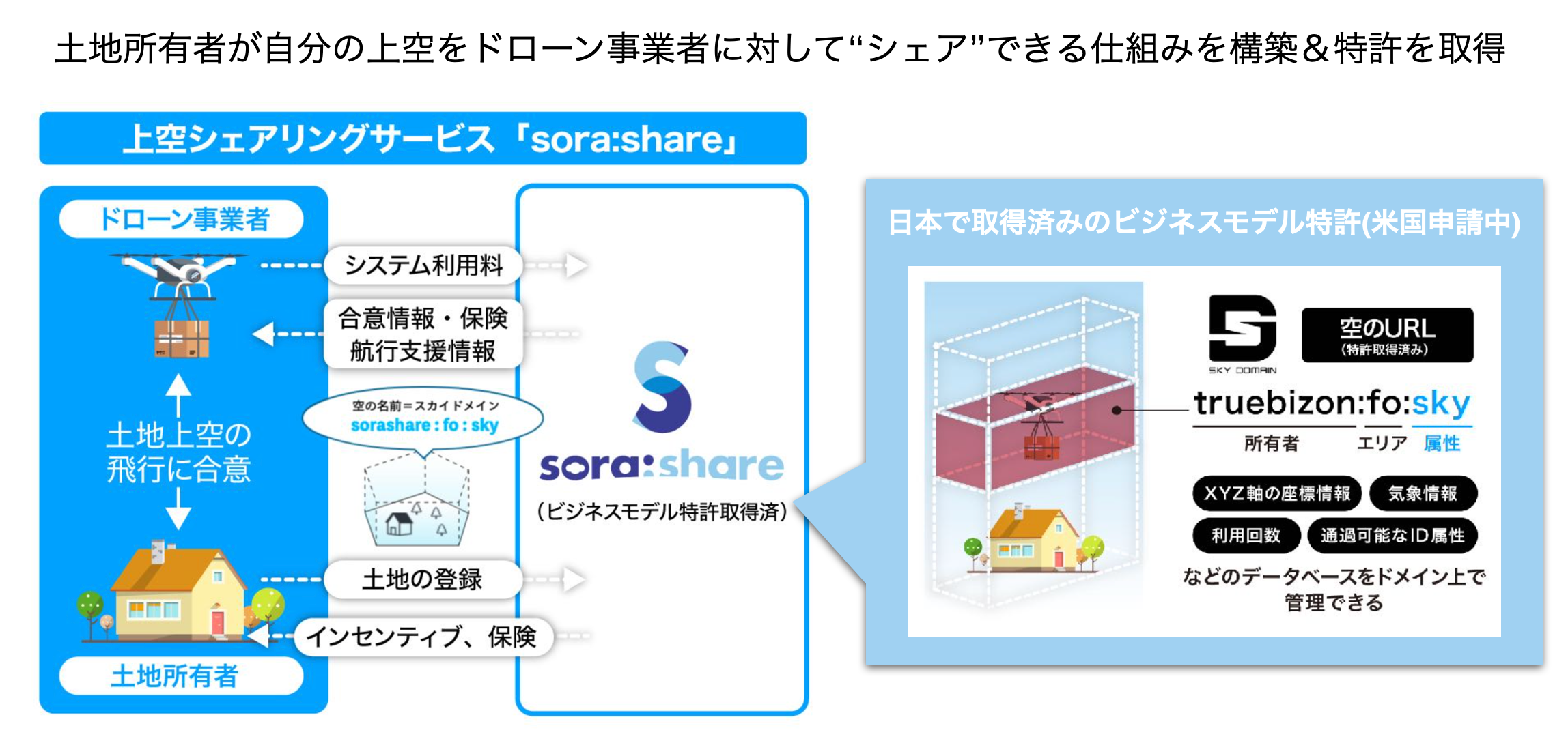 トルビズオンが提供する「sora:share(ソラシェア)」は、2018年10月より開始したドローンが安全に空を飛行するためのサービスです。