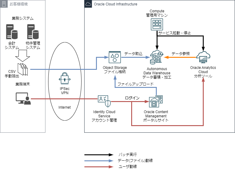会計システムや物件管理システムなどから抽出される物件や取引先、顧客、地域別空室率、平均賃料などの様々なデータ、OCI上の自律型データ集積基盤ADWに格納します。営業部門が簡単な操作でアクセス・分析できるOACを活用したダッシュボードデータ活用による営業活動。また、Oracle製品で統一することにより、高いセキュリティと拡張性、保守窓口の一本化による容易な運用が可能となります。