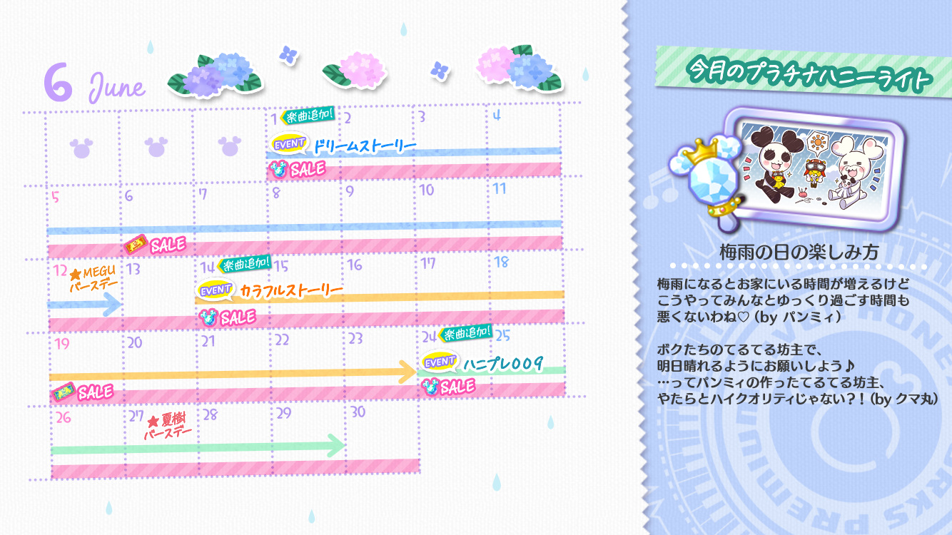 6月は南が主役を務める「ドリームストーリーイベント」の開催や、高校卒業後の夏樹と優の姿を中心に描いた「カラフルストーリーイベント」を開催いたします。あわせて、ガチャでは人気キャラが★5で新登場する「ハニプレリミックス」や「MVセレクション」を開催いたします。