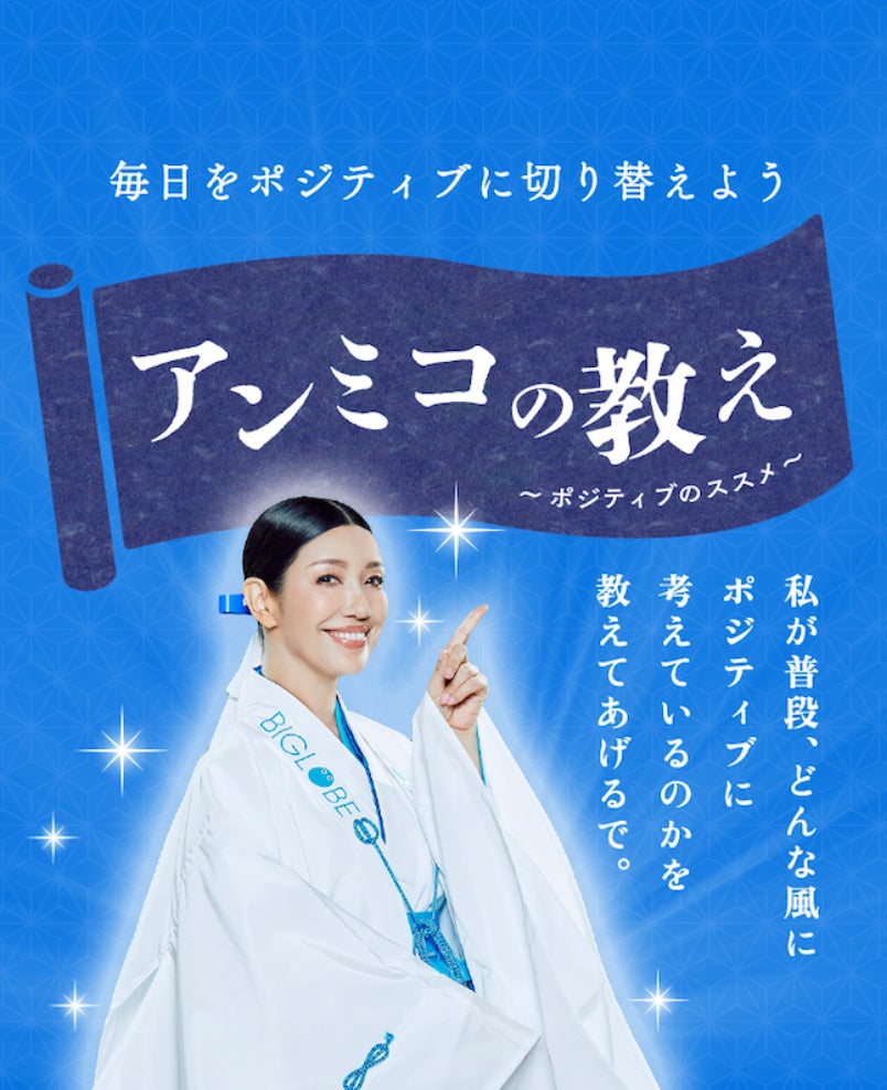 「ビッグローブ光」は、世界初の技術(*2)を持ちお客さま満足度93%(*3)のインターネット通信サービスです。今回のキャンペーンでは「ビッグローブ光」の特長である、信頼と実績を伝えるべく、光回線であなたの人生が明るくなってほしいとの思いで「人生に、光あれ。」をキャッチコピーにしました。どんなときでもポジティブに物事を捉える、超前向き思考なモデル・タレントのアン ミカさんが、オンライン「光の神社」の光の巫女「アンミコ」となり、安心の伝道師としてポジティブな言葉を教えてくれる様々なコンテンツを用意しました。