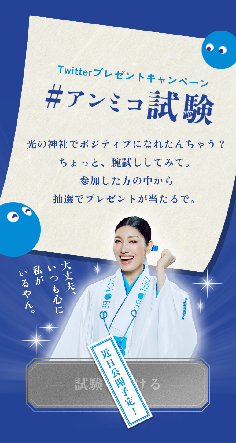 「ビッグローブ光」は、世界初の技術(*2)を持ちお客さま満足度93%(*3)のインターネット通信サービスです。今回のキャンペーンでは「ビッグローブ光」の特長である、信頼と実績を伝えるべく、光回線であなたの人生が明るくなってほしいとの思いで「人生に、光あれ。」をキャッチコピーにしました。どんなときでもポジティブに物事を捉える、超前向き思考なモデル・タレントのアン ミカさんが、オンライン「光の神社」の光の巫女「アンミコ」となり、安心の伝道師としてポジティブな言葉を教えてくれる様々なコンテンツを用意しました。