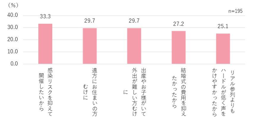 披露宴・ウエディングパーティ実施者のうち、オンラインでの参加も可とした割合は27.7%だった。オンライン参加も可とした理由は、「感染リスクを抑えて開催したいから」が最も多く33.3%、次いで「遠方にお住まいの方むけに」が29.7%、「出産やお子様がいて外出が難しい方むけに」が29.7%、となり、感染対策だけではなく、出席者の都合も考慮できる点が上位を占めた。出席に対する選択肢の増加は、多様化する結婚式の在り方のひとつとなりそうだ。【図3】【図4】