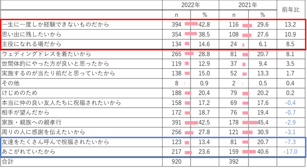 結婚式をすると決めた理由で増加幅が大きかったのは、「一生に一度しか経験できないものだから」が前年比13.2pt増の42.8%、次いで「思い出に残したいから」前年比10.9pt増で38.5%、「主役になれる場だから」前年比8.5pt増で14.6%となった。減少幅が大きかったのは、「あこがれていたから(23.6%:前年比17.0pt減)」、「友達をたくさん呼んで祝福されたいから(13.4%:前年比7.3pt減)」となった。おもてなしを重視する「ゲストファーストな結婚式」から「感謝や想いを伝え、思い出に残す結婚式」を重視する傾向になっていることがうかがえる。【図5】【図6】