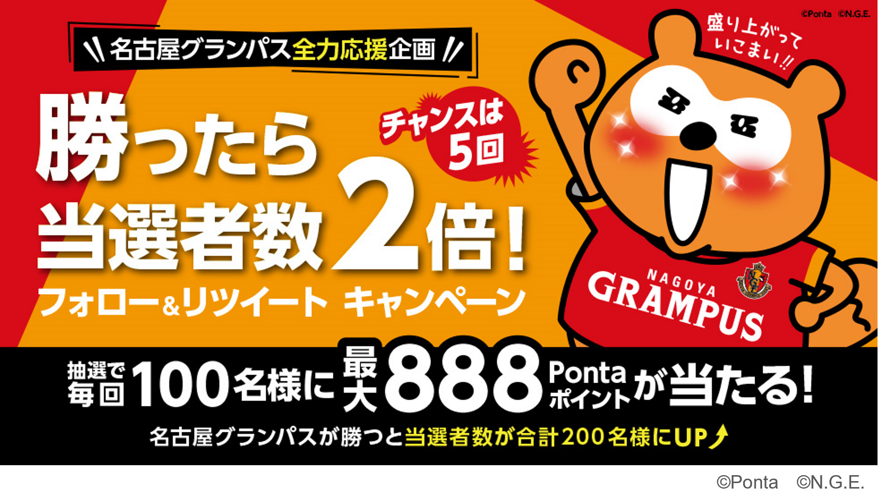 共通ポイントサービス「Ponta(ポンタ)」を運営する株式会社ロイヤリティ マーケティング(本社:東京都渋谷区、代表取締役社長:長谷川 剛、以下「LM」)は、2022年シーズンの名古屋グランパスのダイヤモンドパートナーとして応援企画を展開しています。2022年9月16日(金)~11月6日(日)、最大888Pontaポイントをプレゼントする「勝ったら当選者数2倍!フォロー&リツイートキャンペーン」をグランパスポンタ公式Twitterにて開催いたします。