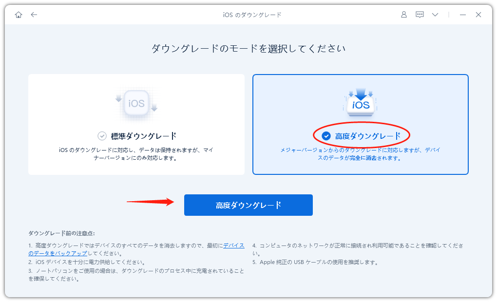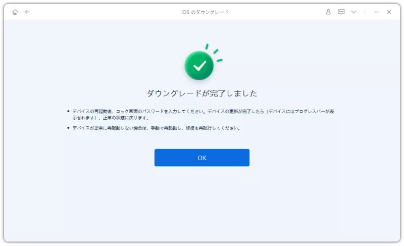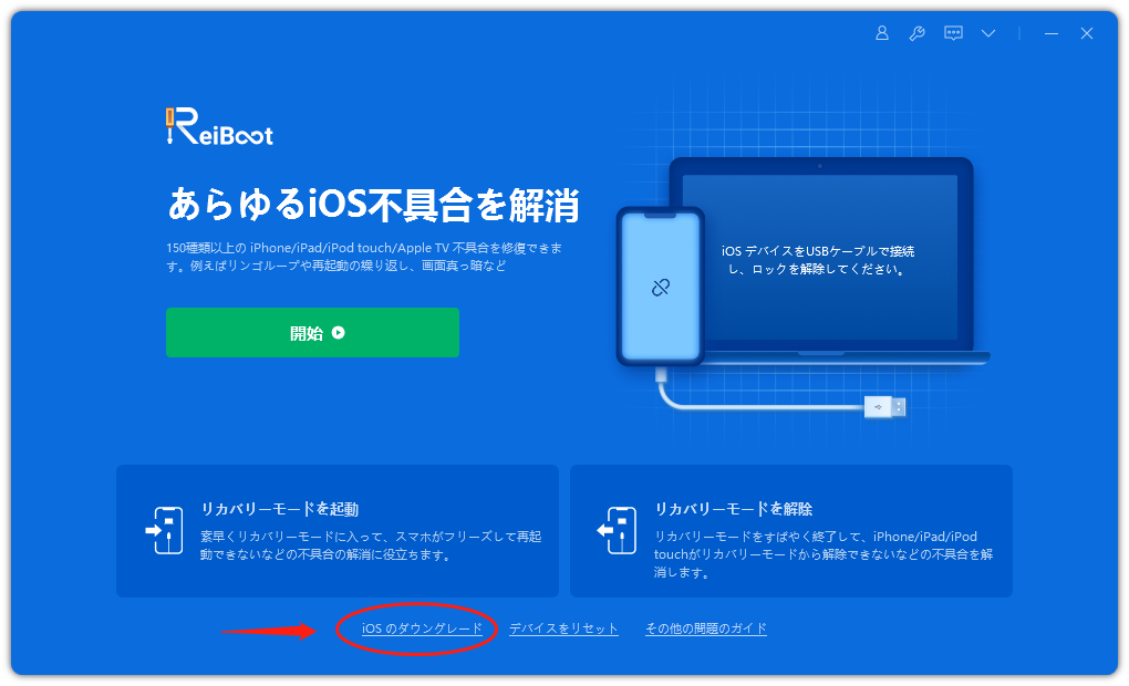 手順1:ReiBootを起動して「iOSのダウングレード」をクリックします。
