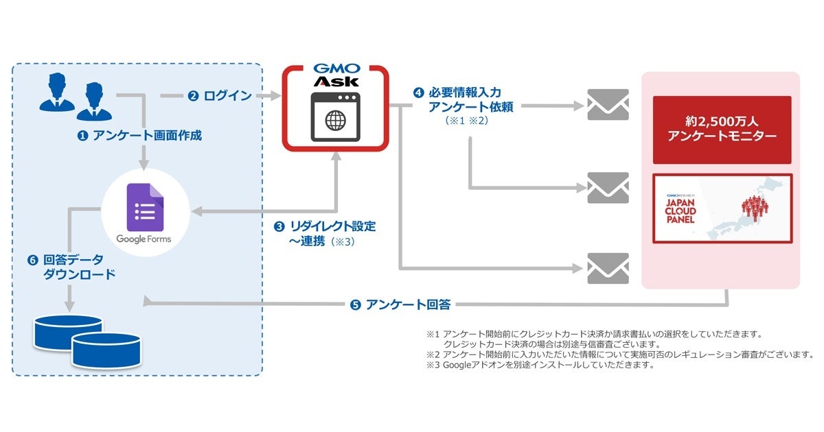 また、世界でも個人・法人を問わず幅広い方々に利用されている「Google Forms®」と連携しました。これにより、「GMO Ask」を利用することで、GMOリサーチが提供する2,747万人(※1)への調査が可能な国内最大級のパネル(※2)ネットワーク「JAPAN Cloud Panel」のモニターに向けて、より多くの皆さまがスムーズにアンケートを配信することができます。
