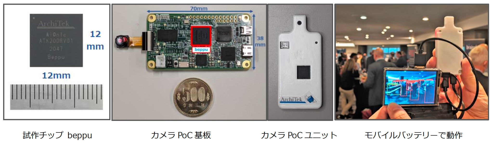 ArchiTekは、上記のヘテロジニアスなアーキテクチャーをTSMCの12nm FinFETプロセスに実装した試作チップ「beppu」を開発し、画像処理およびAI推論のデモやPoC (Proof of Concept) を行なってきました。「beppu」は、小型・低消費電力でファンレスのシステムが構築可能なためシステムの信頼性は高く、屋外での防塵防滴などの用途にも適しています。「beppu」を搭載したカメラPoCユニットは、モバイルバッテリーひとつで動作するため可搬性が高く設置も容易なので、性能評価やPoCなどが簡単に実施できます。