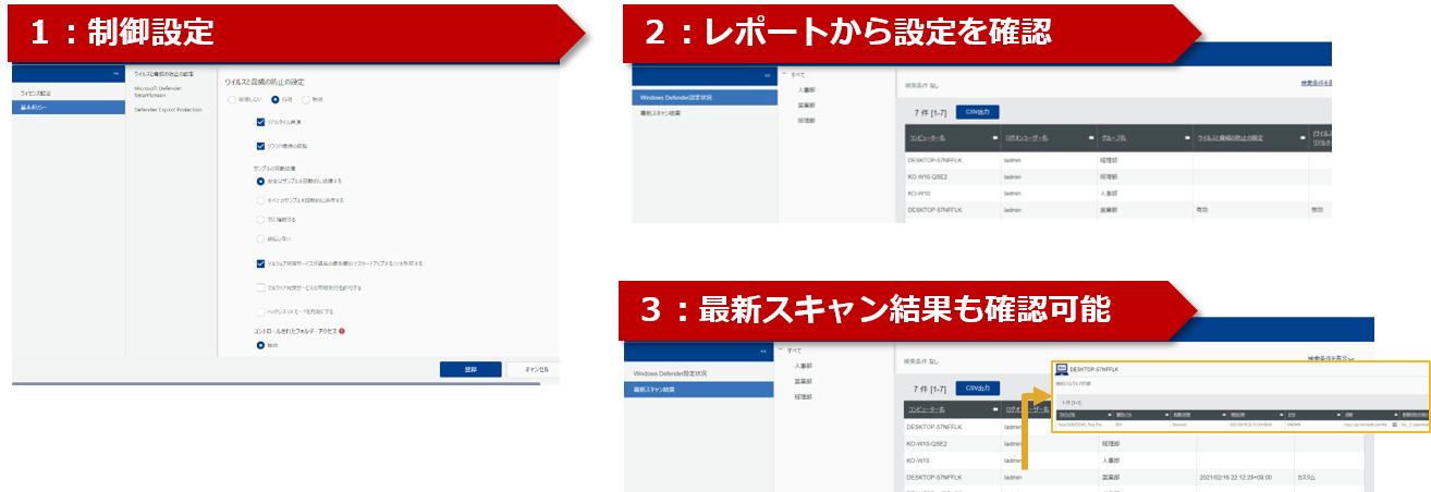 クライアントPCの「Windows Defender」(※2)の集中管理を実現する機能です。PCごとの設定状況やマルウェアの検知状況、またウイスルスキャン結果を一元管理できるため、システム管理者の業務負担を軽減し組織全体のセキュリティ強化を支援します。