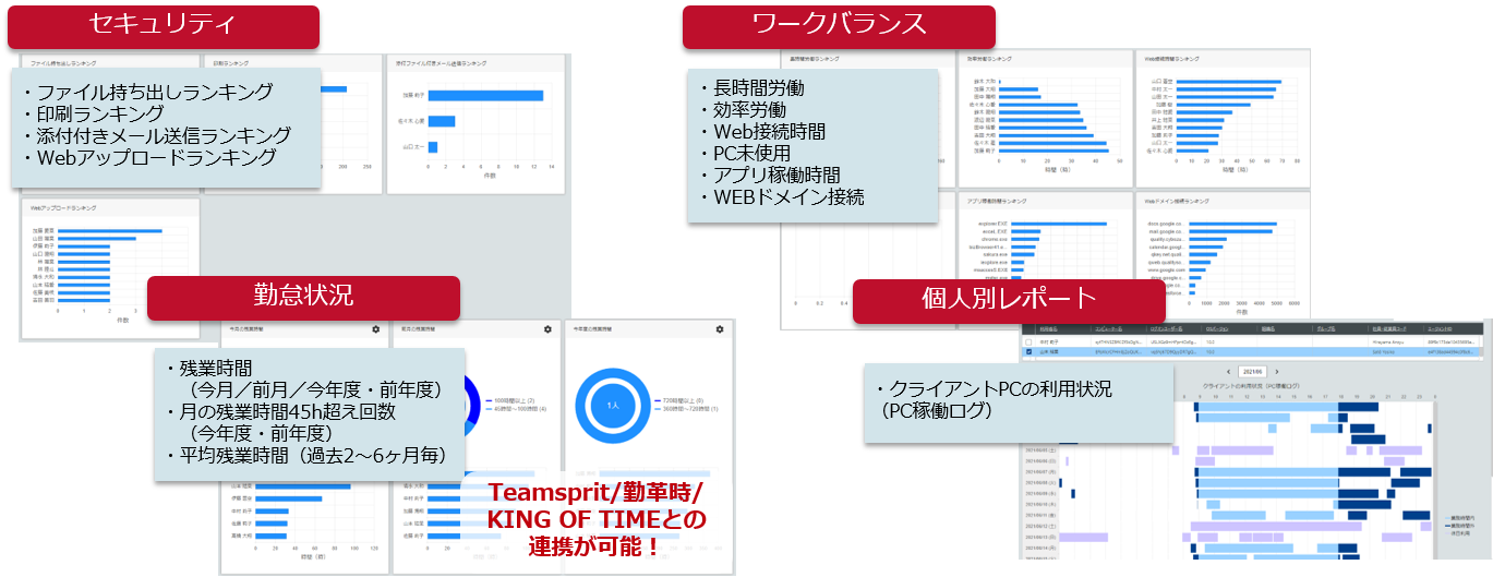 クライアントPCの操作ログ(操作履歴)を記録する機能です。新オプション「Log Analytics」では、取得できるログの種類が大幅に増強され、Webメールのみならず、デスクトップアプリのメール送受信記録や、起動したアプリケーションの稼働ログなどが取得可能になりました。取得したログは「セキュリティ」「ワークバランス」「勤怠状況」「個人別」の4つの指標で可視化でき、テレワーク下においてもクライアントPCの稼働状況を一目で把握することができます。さらに、ログデータはクラウド上で最大7年間保存できるため、セキュリティ事故の原因究明も、より長くさかのぼって行えるようになりました。