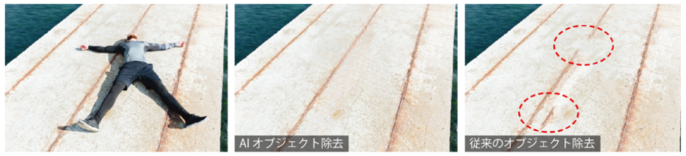 ・対象オブジェクト、背景をAIが解析し、オブジェクトの背景を推測して塗りつぶすことによって、より自然なオブジェクト除去を実現。