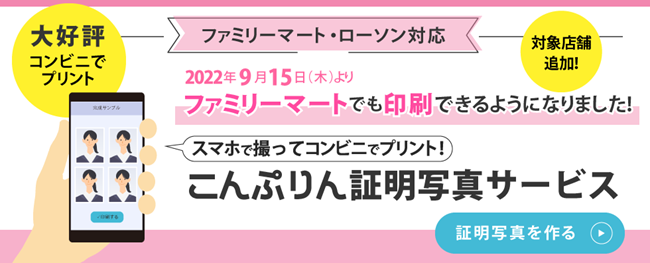 2022年より、お手持ちのスマートフォンやパソコンから画像を選んで証明写真を作り、コンビニで印刷できる「こんぷりん証明写真サービス」も開始しました。