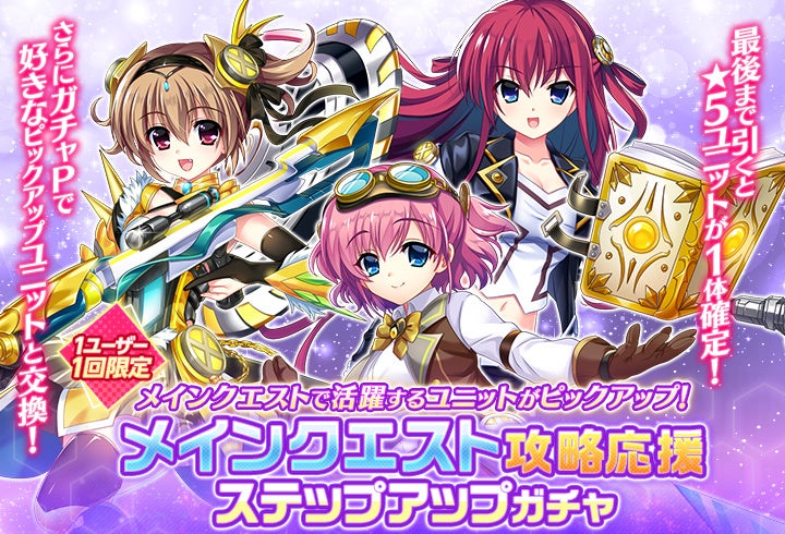 9月15日より、STEP4まで回すと★5ユニットが確定で2体獲得でき、更にその内1体は光属性の★5ユニットを選んで獲得できるメインクエスト攻略応援ステップアップガチャが開催中!