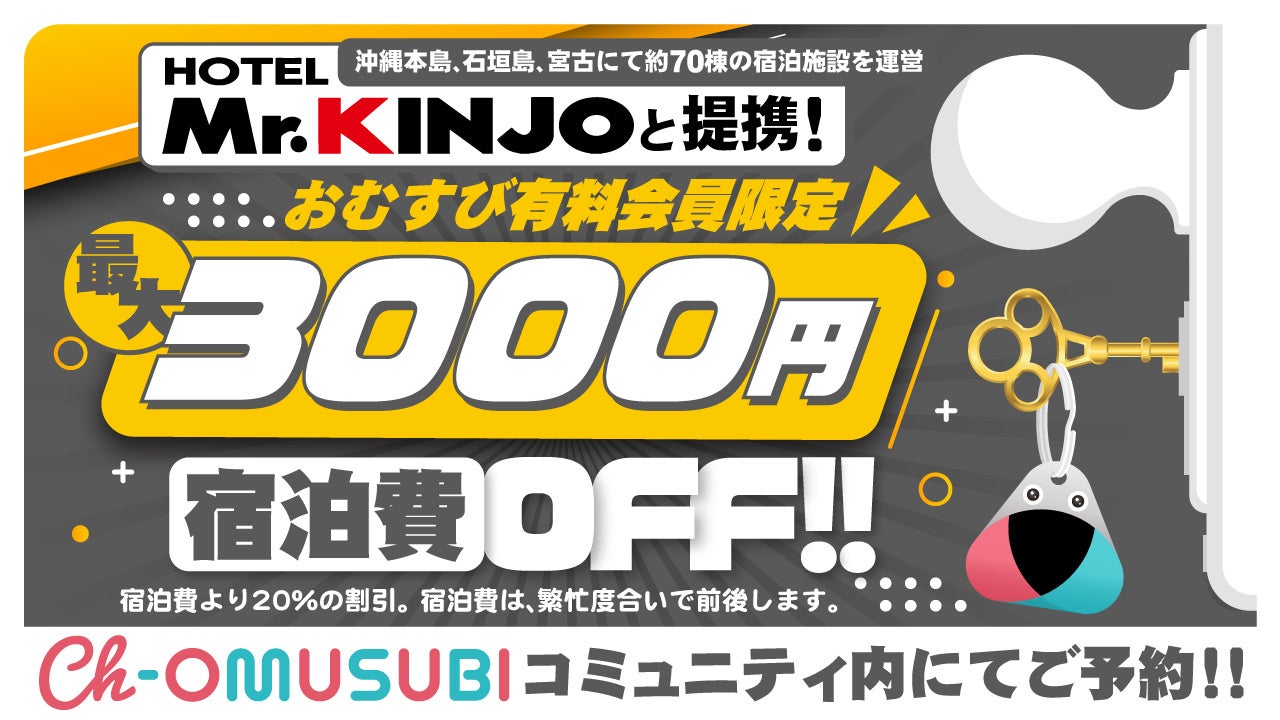 1. おむすびチャンネル有料会員は、所定の条件により、Mr.KINJO施設の宿泊料から20%の割引サービスを受けることが可能となります。季節および宿泊施設会場により宿泊料は変動し、割引金額は、一泊あたり最大3000円/一室となる場合もあります。閑散シーズンは、宿泊費自体が低くなるため、割引金額も応じて減少します。なお、今後、割引率が変動する可能性があります。