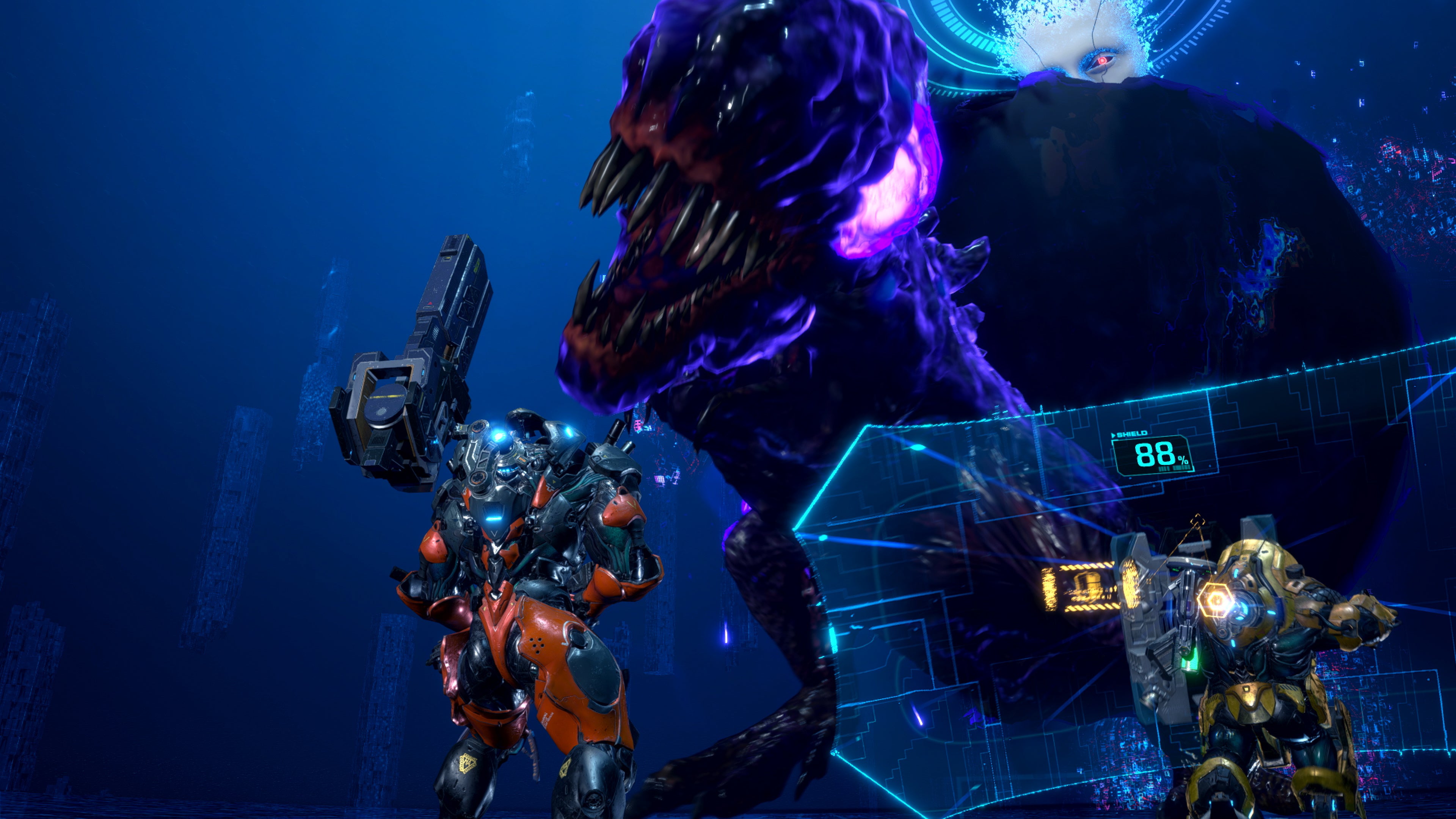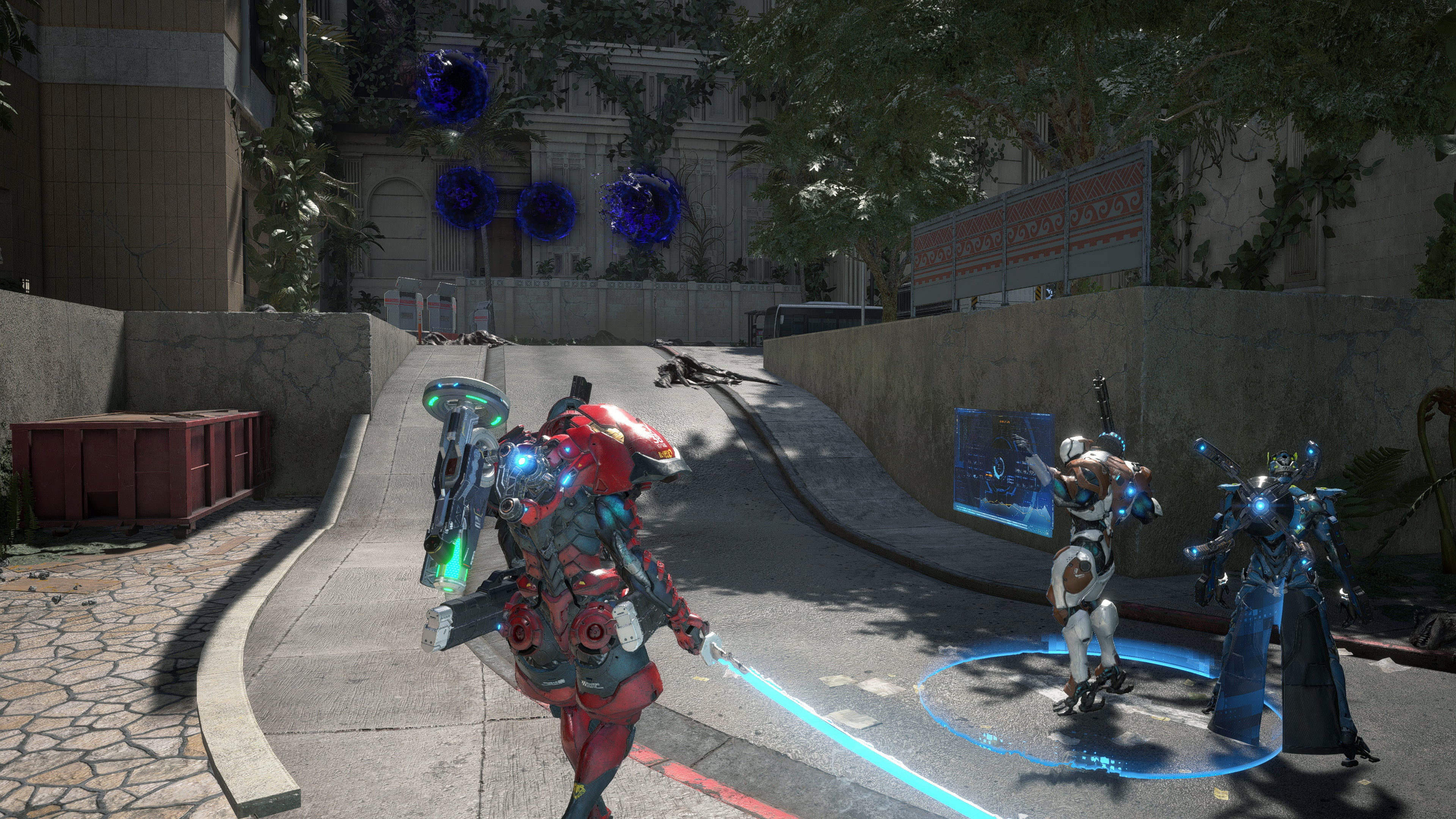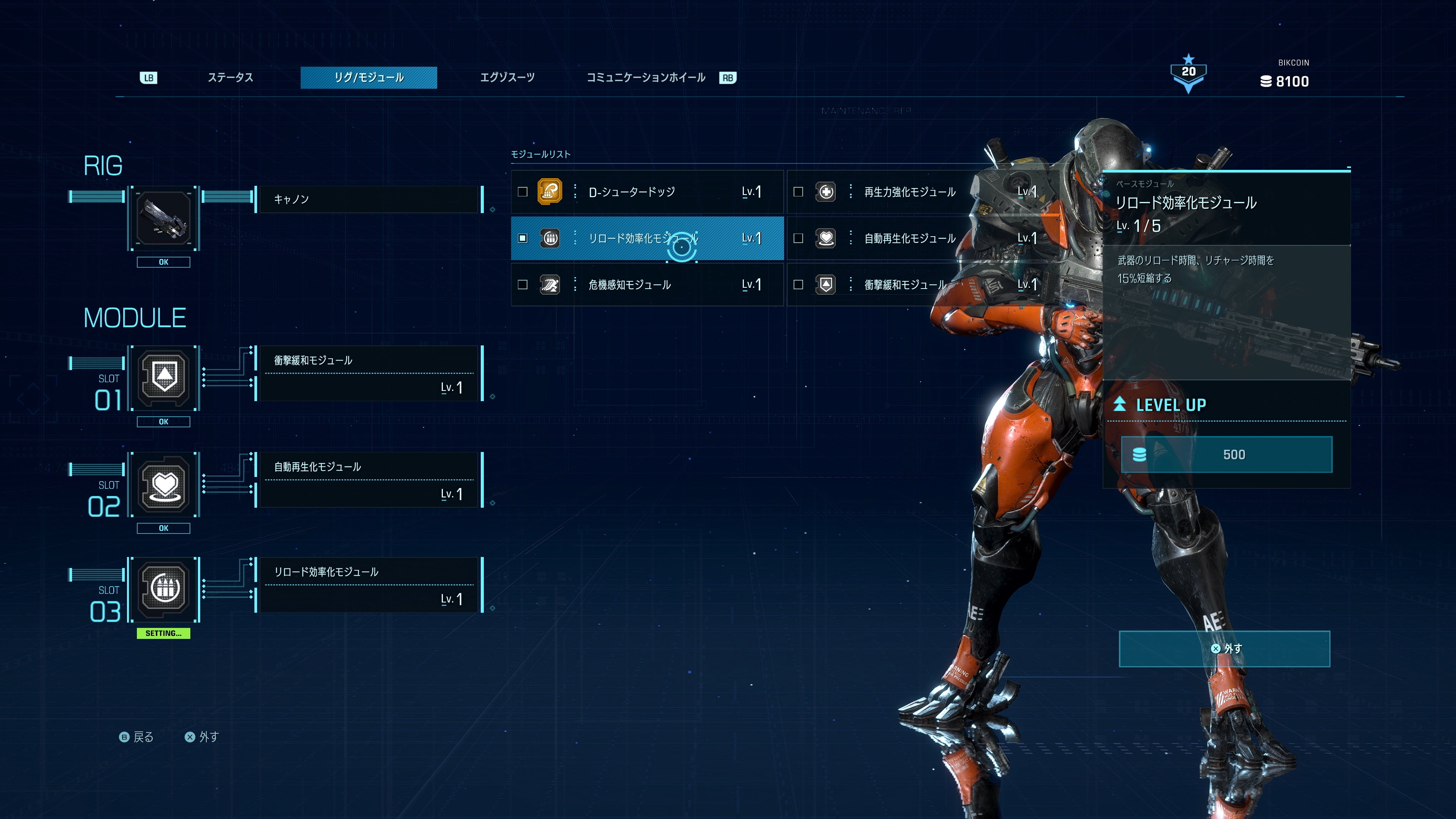 スーツの耐久力を強化したり、武器のリロード速度を上げたり、さらには、スーツ毎のアクティブスキルの性能を変化させる「モジュール」の付け替えや強化を行うことができる。
