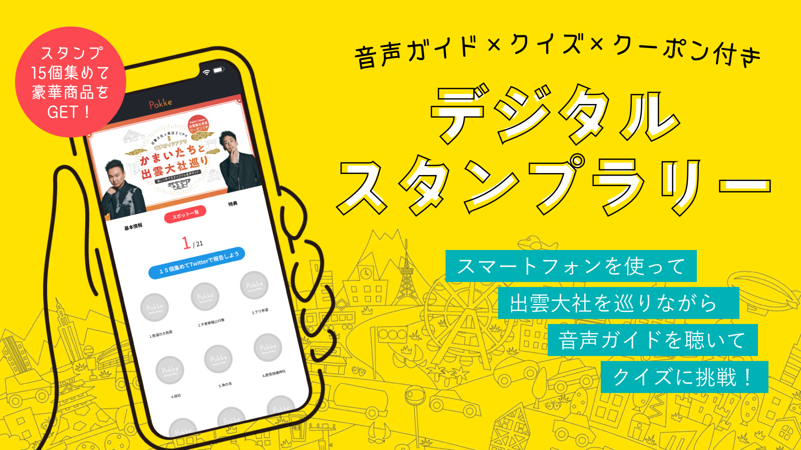 概要 :ナレーターには吉本興業所属の人気お笑いコンビ「かまいたち」を起用した、お笑いコンビの掛け合いによる音声ガイドです。専用のガイドアプリ(有料)をダウンロードしたスマートフォン・タブレットを通じて、出雲大社境内と周辺エリア合計30か所でその場所の説明や観光情報を聴くことができます。なお、音声ガイドアプリ内では凸版印刷株式会社が提供のデジタルクーポン機能を実装しており、市内の対象店舗にて利用することが可能です。