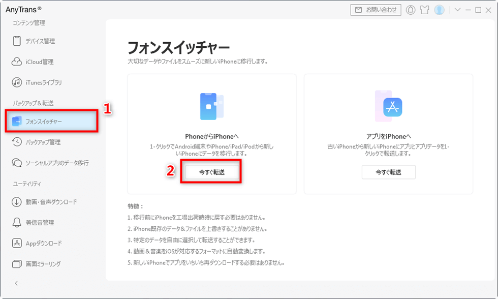 上記の原因を確認して対応する対策も操作しますが、それでもクイックスタートできない場合に、iOSデバイス向け専用のデータ移行ソフト – AnyTransの利用をおすすめします。