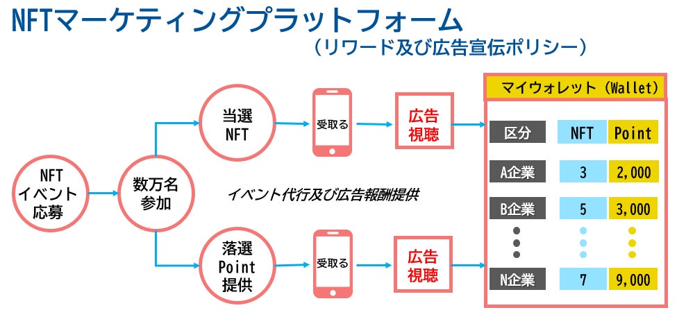 本システムは、広告とNFTを組み合わせ、ファンの可視化やロイヤルカスタマーの把握ができる新しいデジタル広告サービスです。ユーザーは本NFTプラットフォームに登録し、企業のイベントに参加するとNFTやポイントなどの特典を受領できます。イベントだけでなく、プラットフォーム独自の特典を受領することもできます。