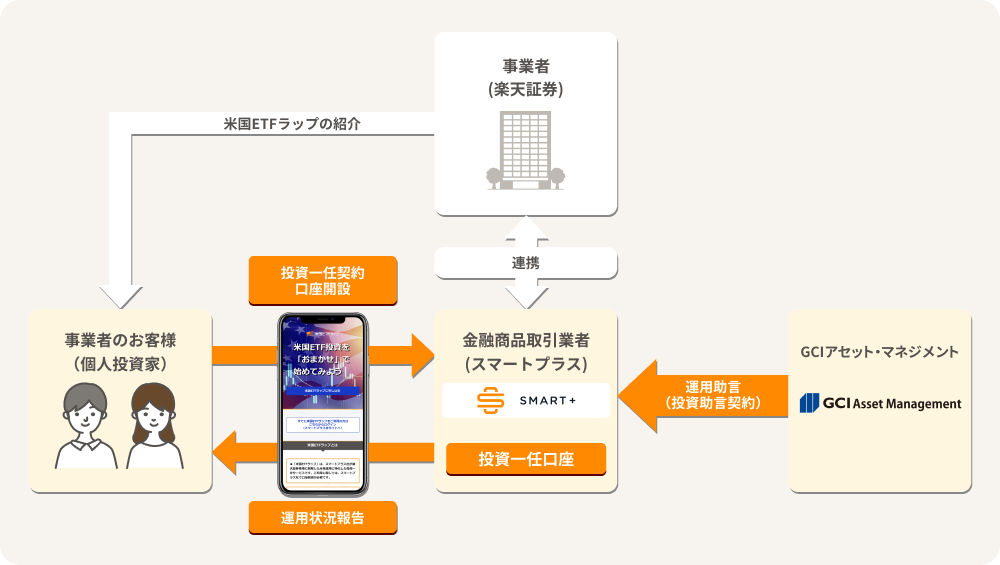 「米国ETFラップ」は、当社が楽天証券株式会社(本社:東京都港区、代表取締役社長:楠 雄治、以下「楽天証券」)と共同で開発したものです。株式会社GCIアセット・マネジメント(本社:東京都千代田区、代表取締役CEO:山内 英貴、以下「GCIアセット・マネジメント」)が投資助言を、当社が証券口座管理および投資一任運用を行います。明日2022年9月17日(土)から、楽天証券のホームページにてお申し込みいただけます。