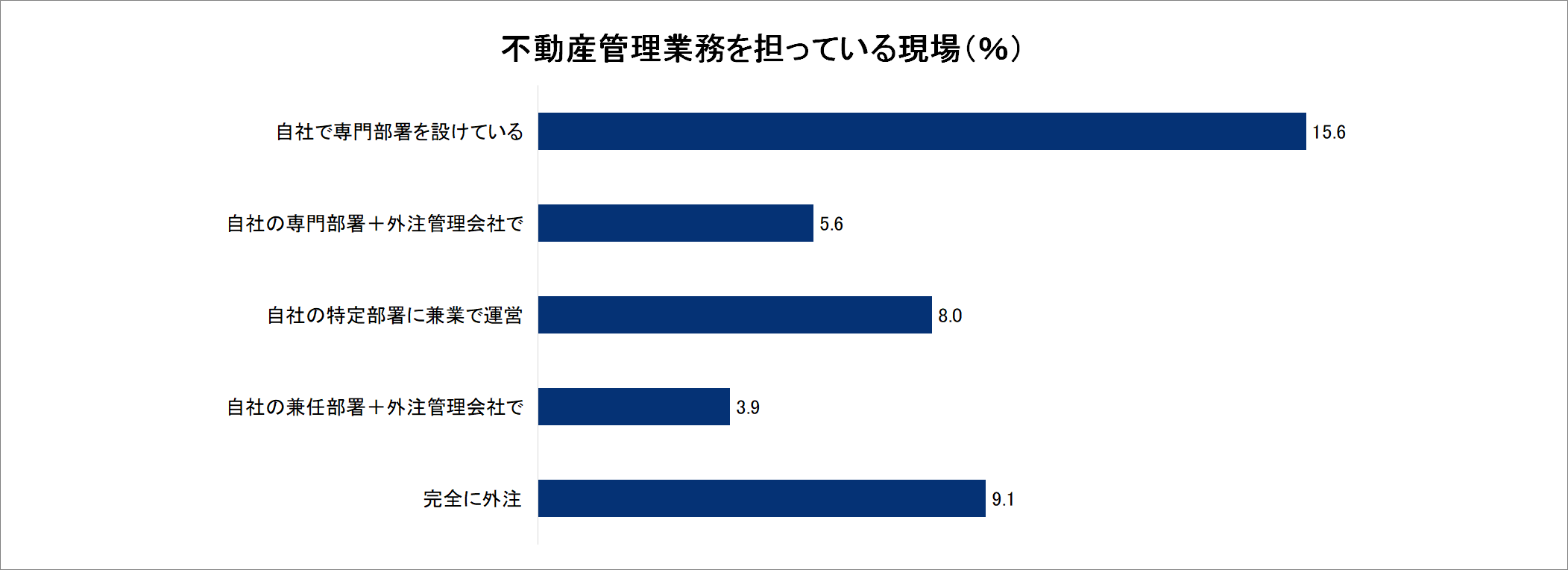 不動産業務を担う現場は、「自社の専門部署」(15.6%)が最も多く、次いで「完全に外注」(9.1%)、「自社の特定部署が兼業」(8.0%)に。