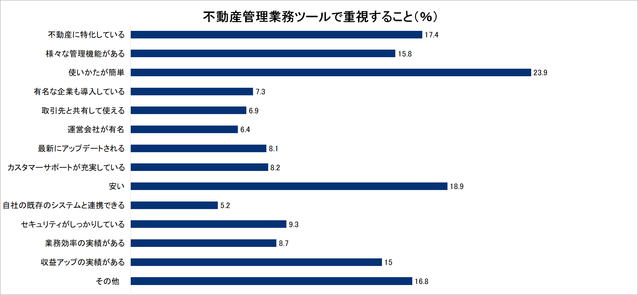 不動産管理ツールで重視することは、「使いかたが簡単」(23.9%)が最多、